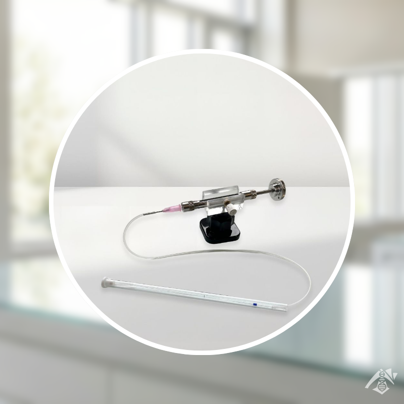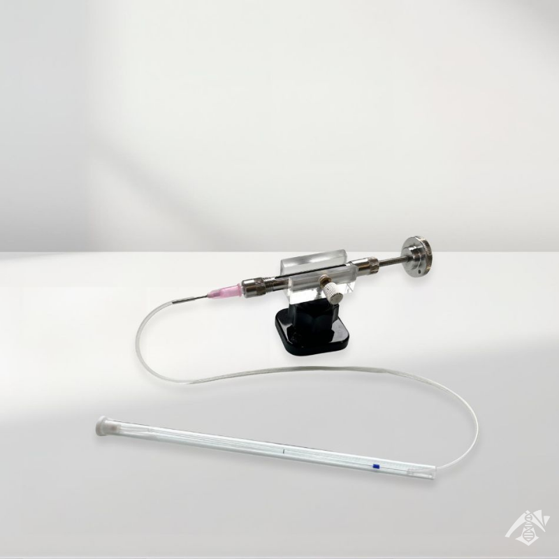 Pompe déportée ergonomique permettant de prélever un grand volume de semence (120µl) et d’inséminer 12 à 15 reines. Fournie avec un support de pompe, un tube porte-capillaire, une tubulure, des joints, 10 capillaires droits 100µl+ 5 pointes capillaires (tips).